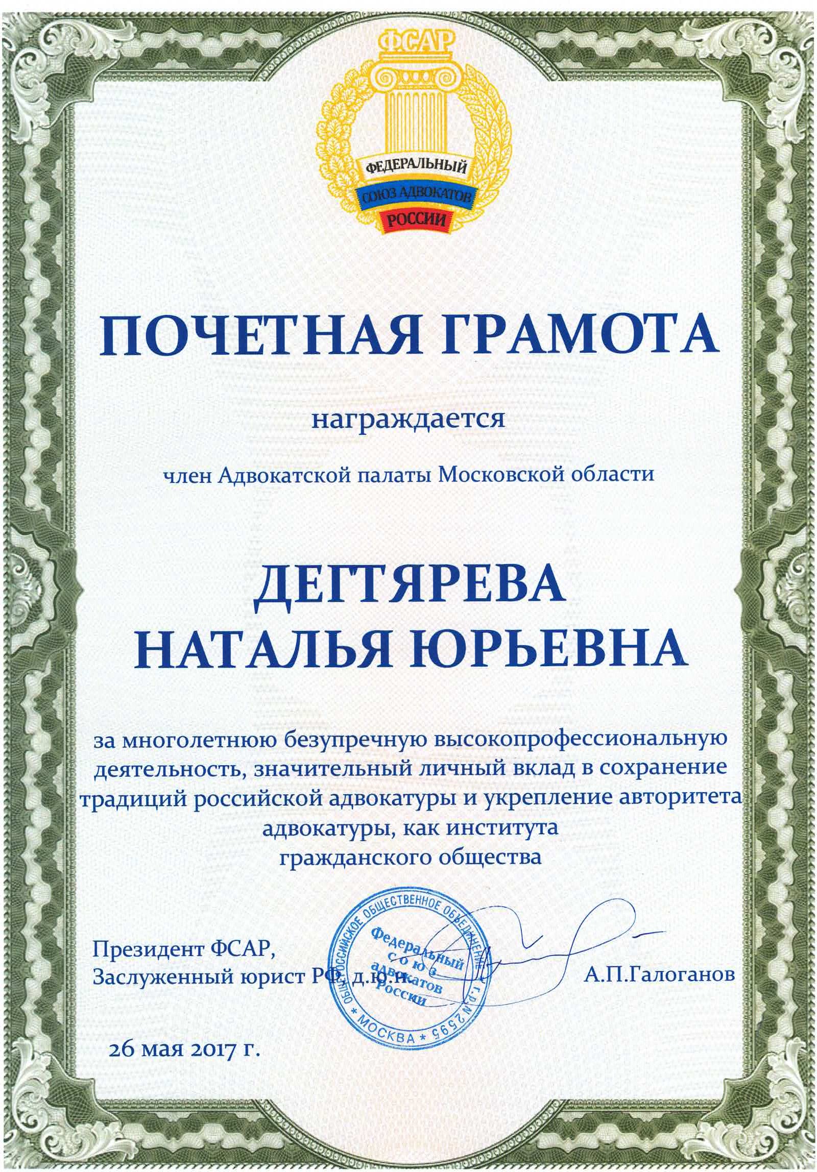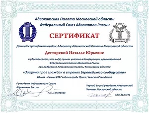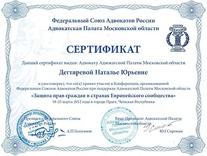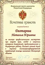 Являясь адвокатом Коллегии адвокатов Московской области "Фемида", Наталья Юрьевна Дегтярева оказывает юридическую помощь гражданам как на территории Москвы и Московской области, так и в других регионах Российской Федерации.