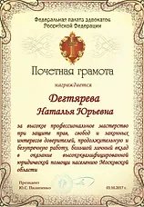 Представляя законные интересы своих доверителей в судах, Наталья Юрьевна Дегтярева как адвокат всегда остается верна правовой позиции доверителя, до конца отстаивая его права, свободы и законные интересы. При осуществлении действий по юридической защите доверителя всегда она всегда старается просчитывать возможные действия своих оппонентов как минимум на шаг вперёд. ​​