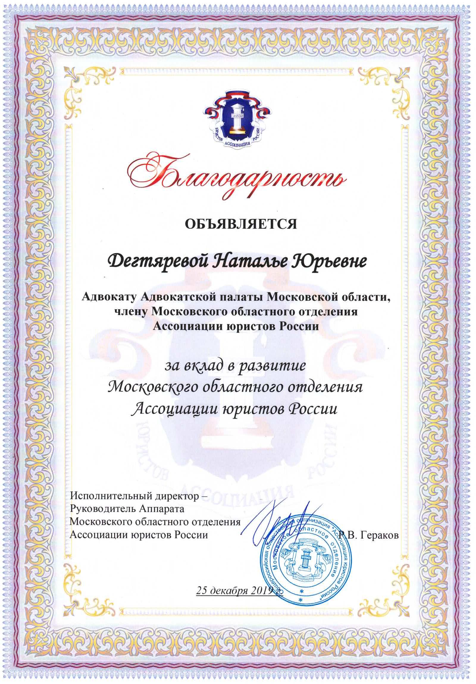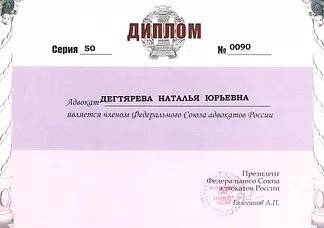 Являясь адвокатом Коллегии адвокатов Московской области "Фемида", Наталья Юрьевна Дегтярева оказывает юридическую помощь гражданам как на территории Москвы и Московской области, так и в других регионах Российской Федерации. Является членом Адвокатской палаты Московской области. Реестровый No 50/3821. ​​