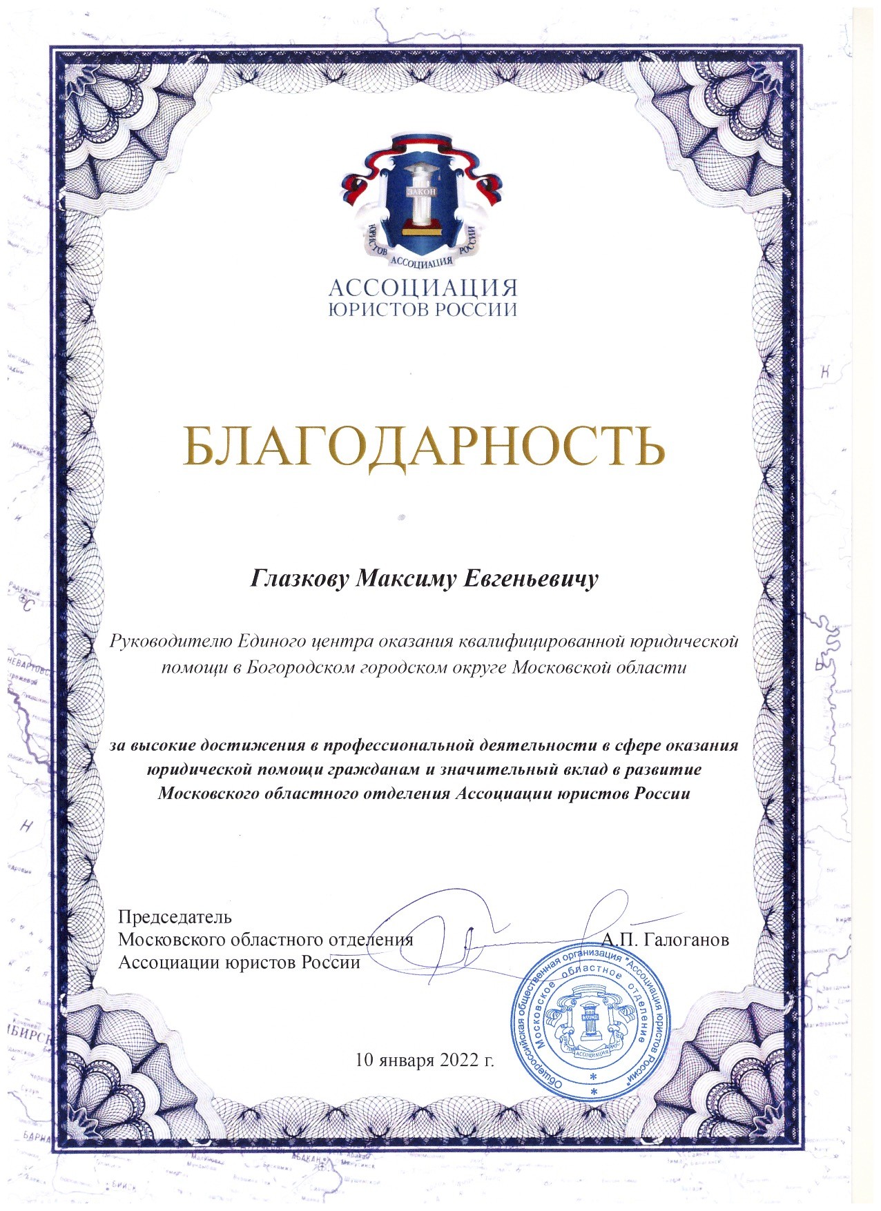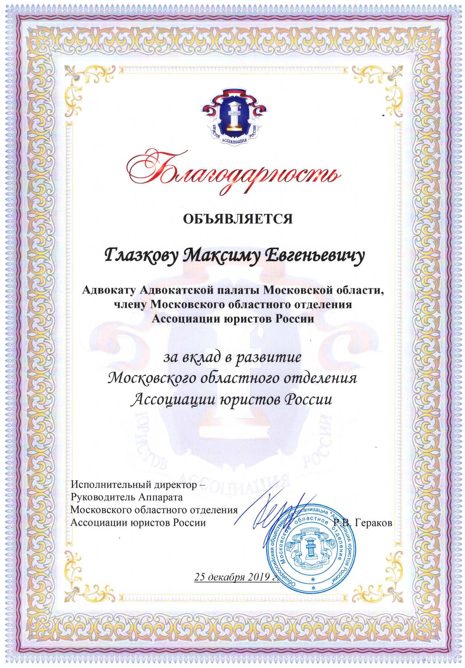 Работа адвокат Глазкова М.Е. отмечена благодарственными письмами и грамотами Ассоциации юристов России, Адвокатской Палаты Московской области, Московской областной Думы, Главы Богородского городского округа МО.